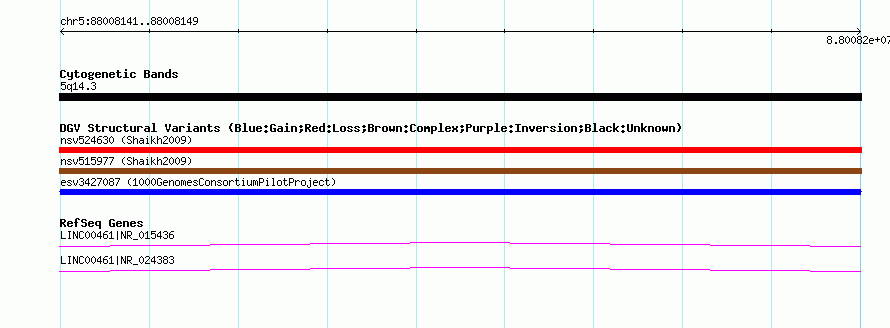 Variant DetailsVariant: esv3427087| Internal ID | 15274043 | | Landmark | | | Location Information | | | Cytoband | 5q14.3 | | Allele length | | Assembly | Allele length | | hg38 | 50 | | hg19 | 50 | | hg18 | 50 |