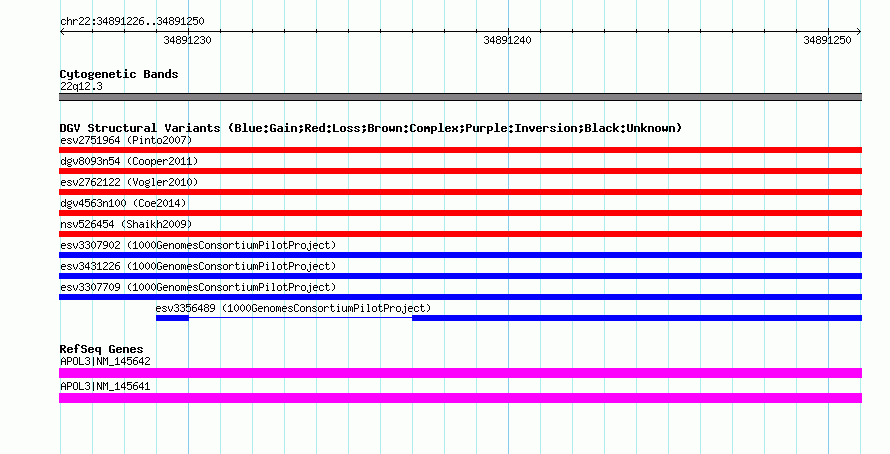 Variant DetailsVariant: esv3431226| Internal ID | 15278182 | | Landmark | | | Location Information | | | Cytoband | 22q12.3 | | Allele length | | Assembly | Allele length | | hg38 | 186 | | hg19 | 186 | | hg18 | 186 |