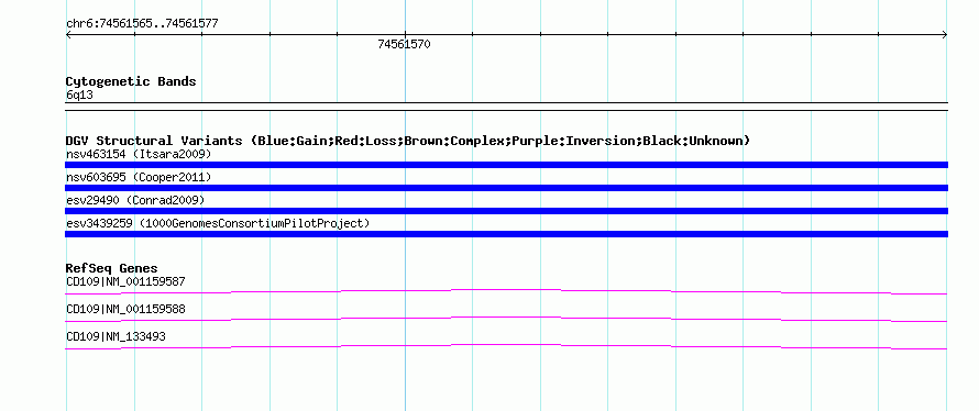 Variant DetailsVariant: esv3439259| Internal ID | 15286212 | | Landmark | | | Location Information | | | Cytoband | 6q13 | | Allele length | | Assembly | Allele length | | hg38 | 288 | | hg19 | 288 | | hg18 | 288 |