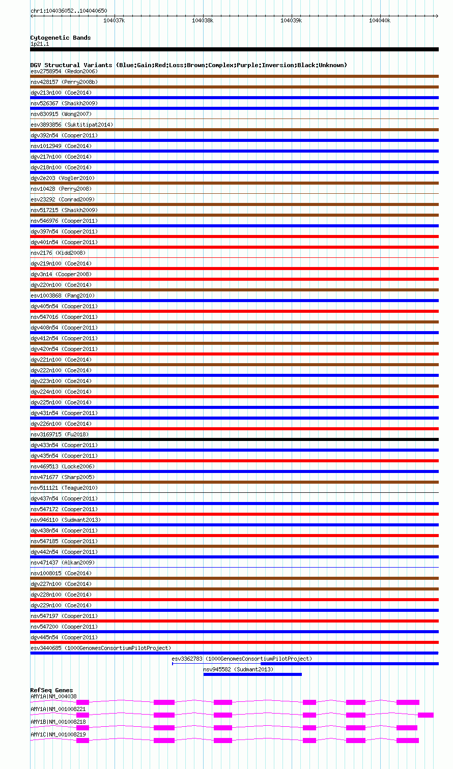 | | Variant Type | CNV duplication | | Copy Number | | | Allele State | | | Allele Origin | | | Probe Count | | | Validation Flag | | | Merged Status | M | | Merged Variants | | | Supporting Variants | essv8691716 | | Samples | NA12892 | | Known Genes | AMY1A, AMY1B, AMY1C | | Method | Sequencing | | Analysis | | | Platform | Illumina | | Comments | | | Reference | 1000_Genomes_Consortium_Pilot_Project | | Pubmed ID | 20981092 | | Accession Number(s) | esv3440685