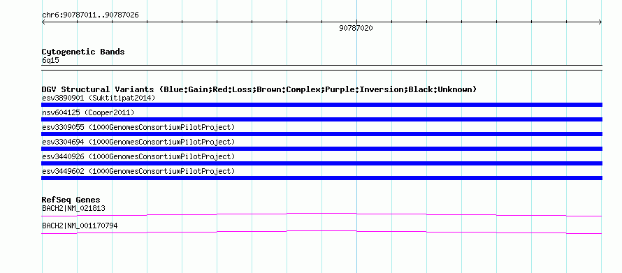 Variant DetailsVariant: esv3449602| Internal ID | 15296550 | | Landmark | | | Location Information | | | Cytoband | 6q15 | | Allele length | | Assembly | Allele length | | hg38 | 289 | | hg19 | 289 | | hg18 | 289 |