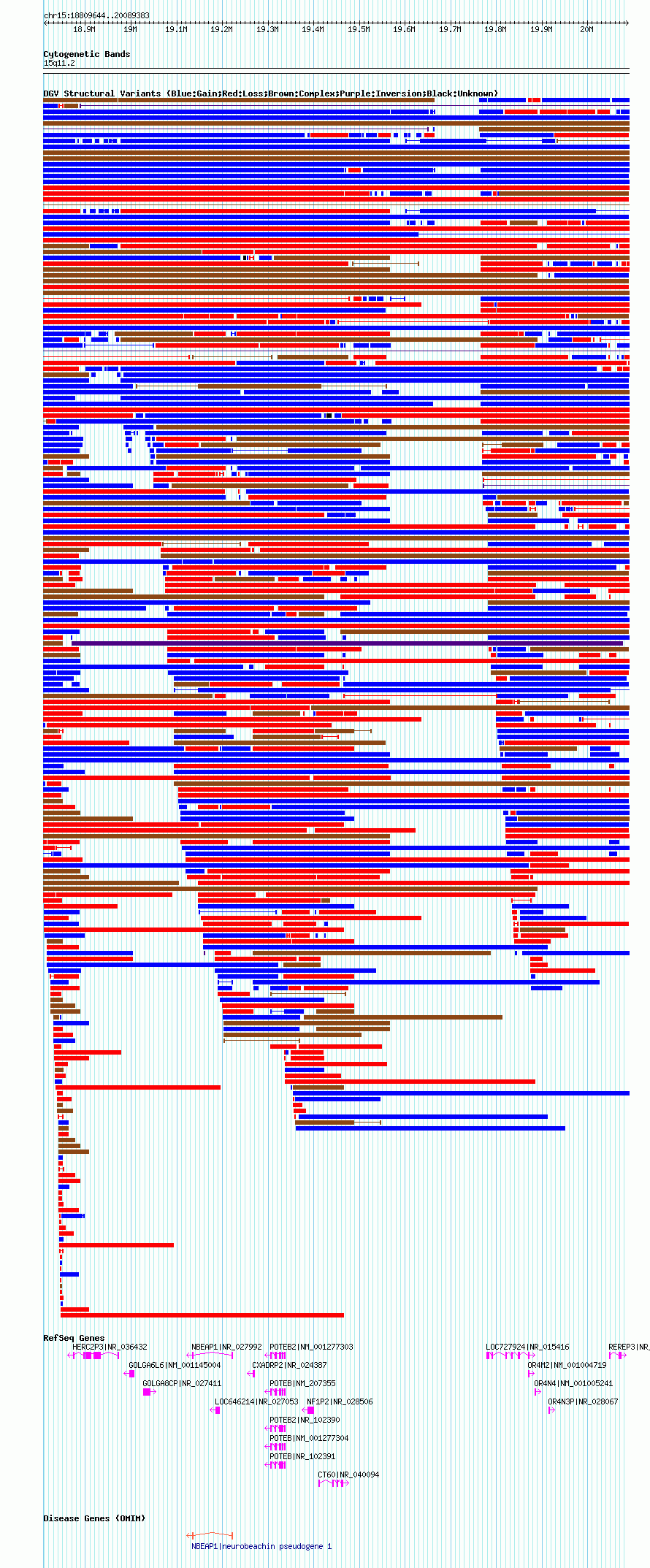 Variant DetailsVariant: esv34537| Internal ID | 12990574 | | Landmark | | | Location Information | | | Cytoband | 15q11.1 | | Allele length | | Assembly | Allele length | | hg38 | 1955692 | | hg19 | 2038390 | | hg18 | 1279740 | | hg17 | 1279740 |
