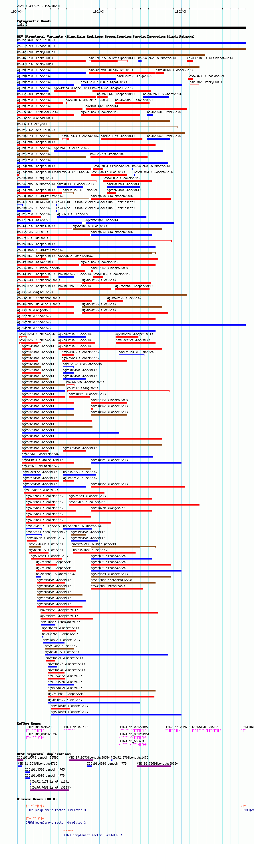 | | Variant Type | CNV gain | | Copy Number | | | Allele State | | | Allele Origin | | | Probe Count | | | Validation Flag | | | Merged Status | M | | Merged Variants | dgv12e55 | | Supporting Variants | essv6986549, essv6978117 | | Samples | NA11840 | | Known Genes | CFHR1, CFHR2, CFHR3, CFHR4, CFHR5, F13B | | Method | SNP array | | Analysis | | | Platform | Affymetrix Mapping 250K Nsp SNP Array | | Comments | Sample level SV from stringent call set | | Reference | Pinto_et_al_2007 | | Pubmed ID | 17911159 | | Accession Number(s) | esv34978