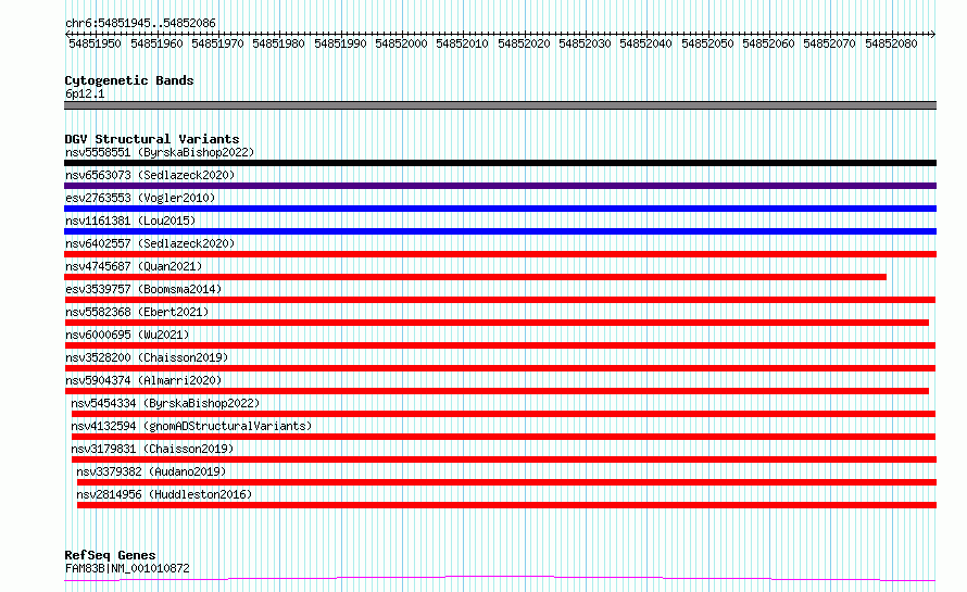 Variant DetailsVariant: esv3539757| Internal ID | 18740873 | | Landmark | | | Location Information | | | Cytoband | 6p12.1 | | Allele length | | Assembly | Allele length | | hg38 | 142 | | hg19 | 142 |
