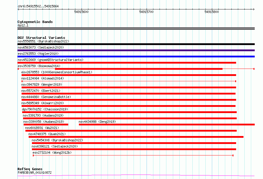 Variant DetailsVariant: esv3539759| Internal ID | 18740875 | | Landmark | | | Location Information | | | Cytoband | 6p12.1 | | Allele length | | Assembly | Allele length | | hg38 | 363 | | hg19 | 363 |