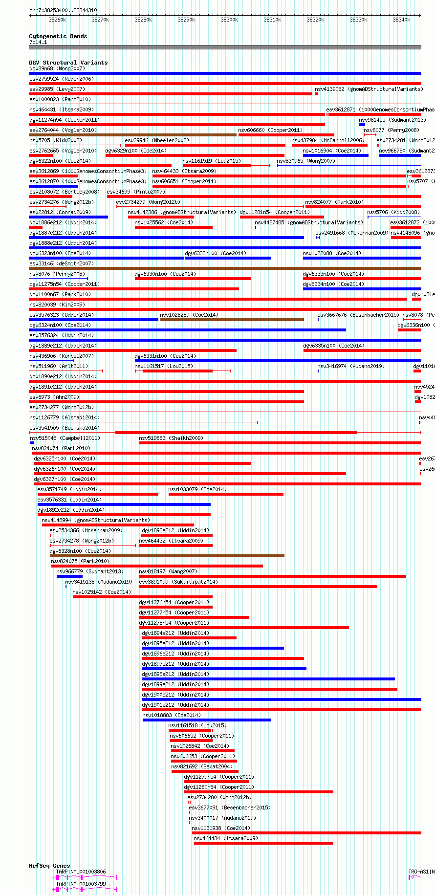 Variant DetailsVariant: esv3541505| Internal ID | 18395895 | | Landmark | | | Location Information | | | Cytoband | 7p14.1 | | Allele length | | Assembly | Allele length | | hg38 | 90911 | | hg19 | 90911 |