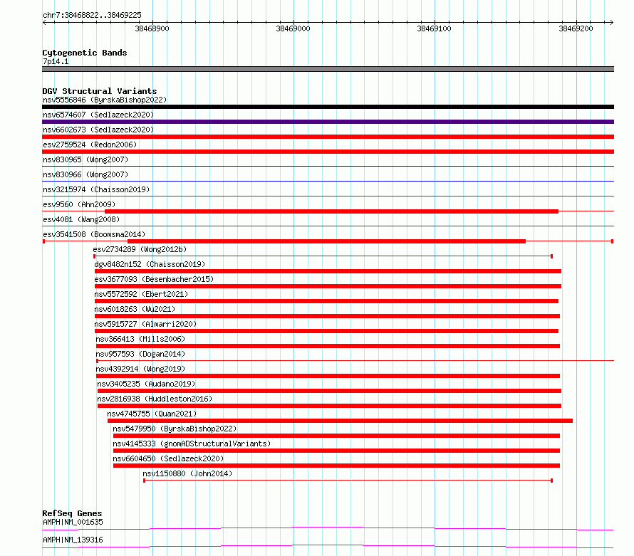 Variant DetailsVariant: esv3541508| Internal ID | 18742584 | | Landmark | | | Location Information | | | Cytoband | 7p14.1 | | Allele length | | Assembly | Allele length | | hg38 | 404 | | hg19 | 404 |