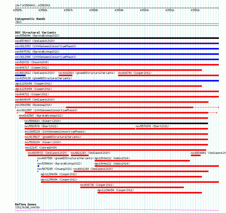 Variant DetailsVariant: esv3541556| Internal ID | 18742632 | | Landmark | | | Location Information | | | Cytoband | 7p13 | | Allele length | | Assembly | Allele length | | hg38 | 8000 | | hg19 | 8000 |