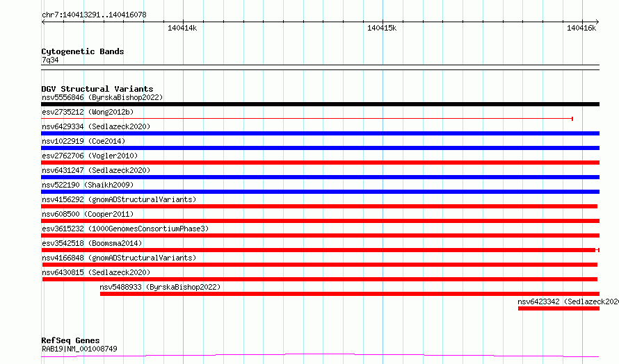 Variant DetailsVariant: esv3542518| Internal ID | 18743594 | | Landmark | | | Location Information | | | Cytoband | 7q34 | | Allele length | | Assembly | Allele length | | hg38 | 2788 | | hg19 | 2788 |