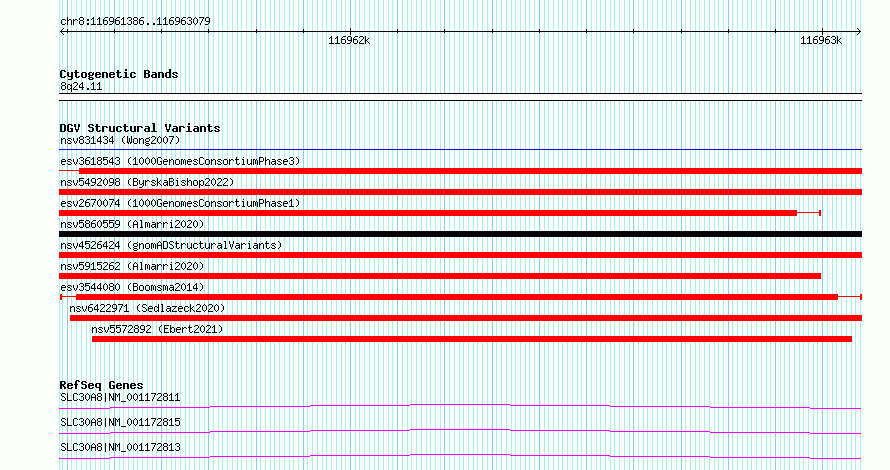 Variant DetailsVariant: esv3544080| Internal ID | 18745156 | | Landmark | | | Location Information | | | Cytoband | 8q24.11 | | Allele length | | Assembly | Allele length | | hg38 | 1694 | | hg19 | 1694 |