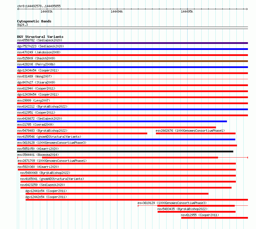Variant DetailsVariant: esv3544401| Internal ID | 18745477 | | Landmark | | | Location Information | | | Cytoband | 8q24.3 | | Allele length | | Assembly | Allele length | | hg38 | 3278 | | hg19 | 3278 |