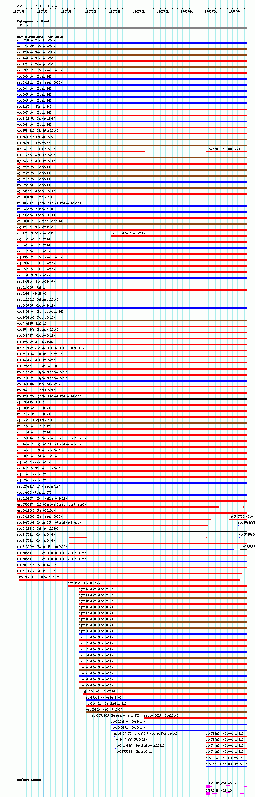 Variant DetailsVariant: esv3544678| Internal ID | 18745754 | | Landmark | | | Location Information | | | Cytoband | 1q31.3 | | Allele length | | Assembly | Allele length | | hg38 | 9576 | | hg19 | 9576 |