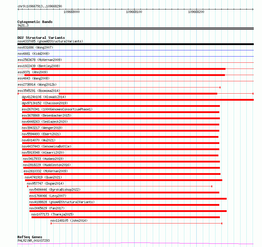 Variant DetailsVariant: esv3545291| Internal ID | 18746367 | | Landmark | | | Location Information | | | Cytoband | 9q31.3 | | Allele length | | Assembly | Allele length | | hg38 | 378 | | hg19 | 378 |