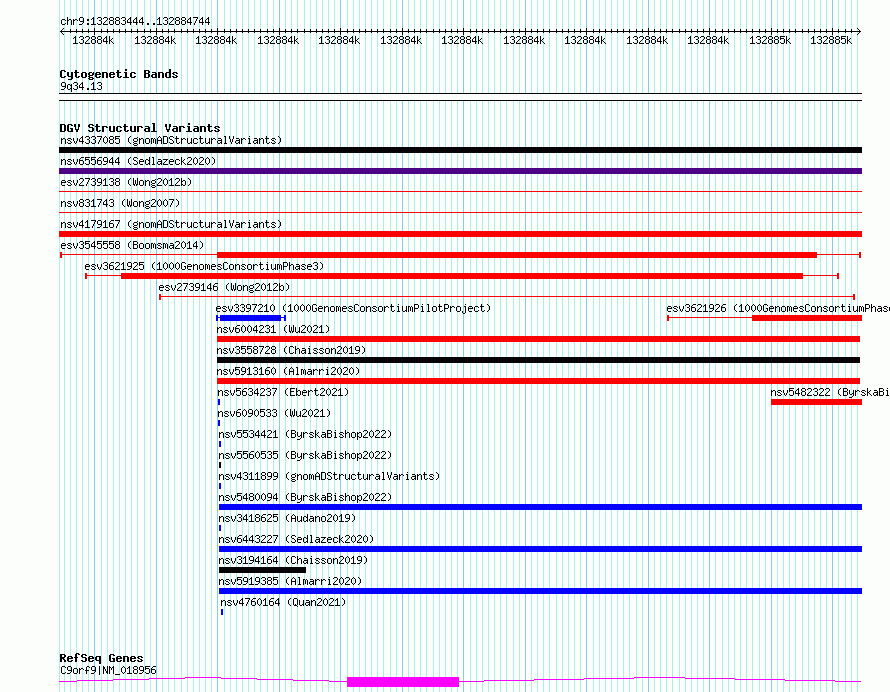 Variant DetailsVariant: esv3545558| Internal ID | 18746634 | | Landmark | | | Location Information | | | Cytoband | 9q34.13 | | Allele length | | Assembly | Allele length | | hg38 | 1301 | | hg19 | 1301 |