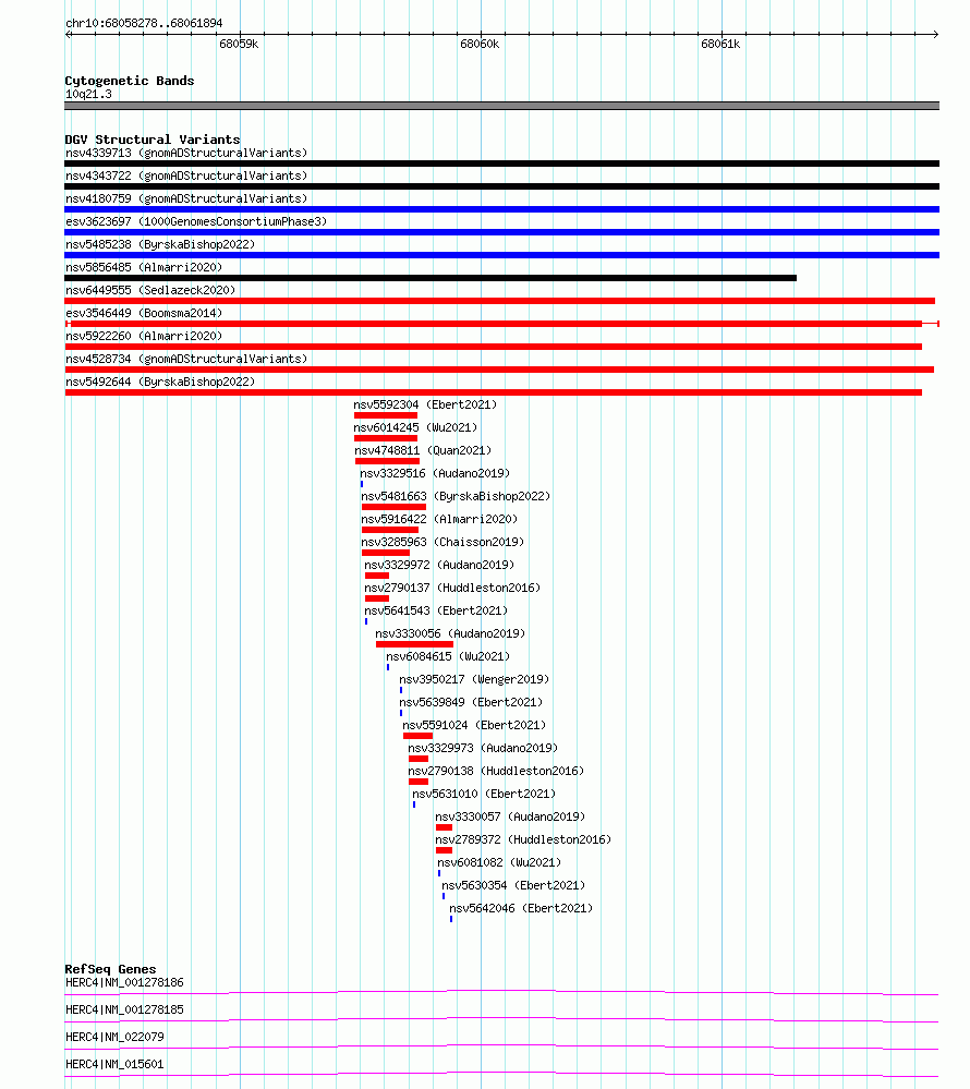 Variant DetailsVariant: esv3546449| Internal ID | 18747525 | | Landmark | | | Location Information | | | Cytoband | 10q21.3 | | Allele length | | Assembly | Allele length | | hg38 | 3617 | | hg19 | 3617 |