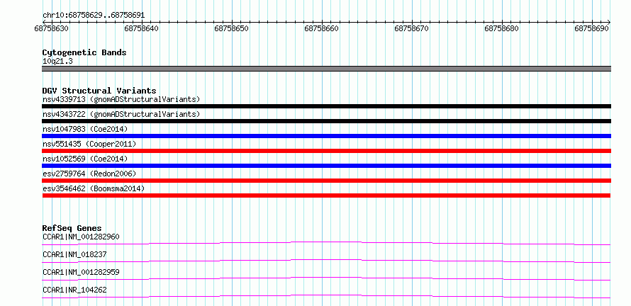 Variant DetailsVariant: esv3546462| Internal ID | 18747538 | | Landmark | | | Location Information | | | Cytoband | 10q21.3 | | Allele length | | Assembly | Allele length | | hg38 | 63 | | hg19 | 63 |