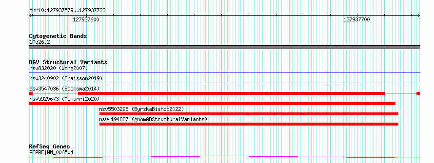 Variant DetailsVariant: esv3547036| Internal ID | 18748112 | | Landmark | | | Location Information | | | Cytoband | 10q26.2 | | Allele length | | Assembly | Allele length | | hg38 | 144 | | hg19 | 144 |