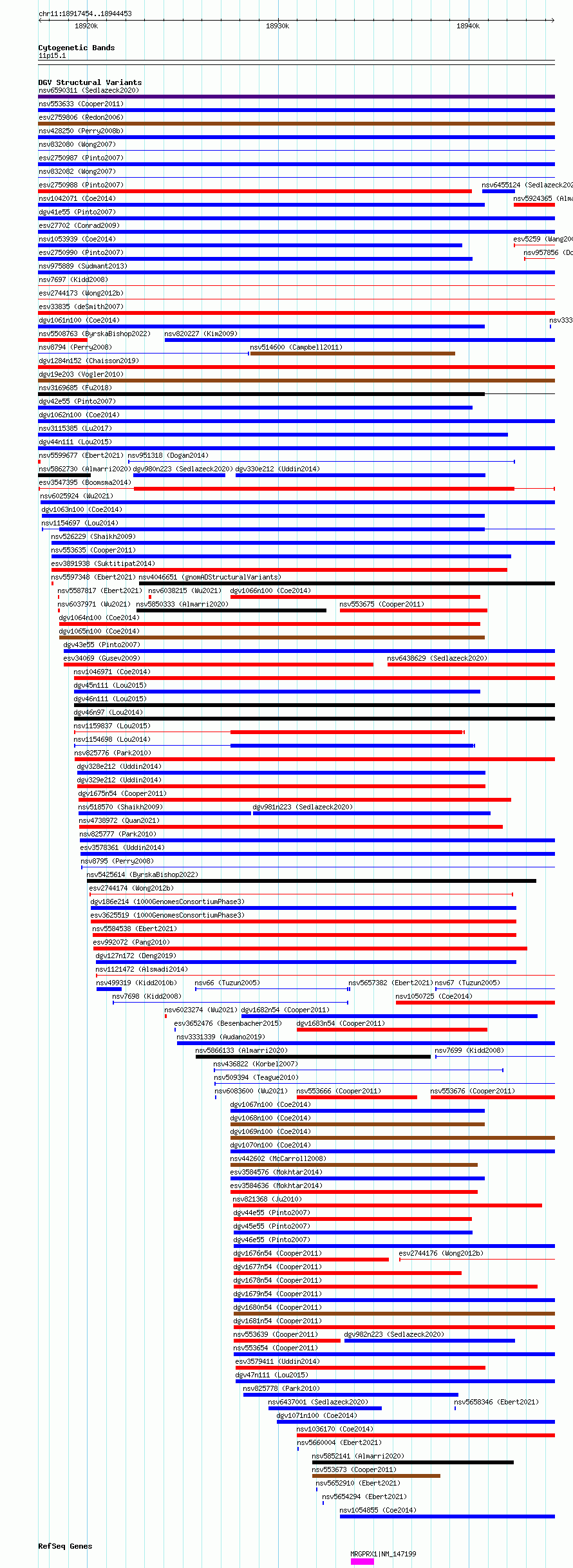 Variant DetailsVariant: esv3547395| Internal ID | 18748471 | | Landmark | | | Location Information | | | Cytoband | 11p15.1 | | Allele length | | Assembly | Allele length | | hg38 | 27000 | | hg19 | 27000 |