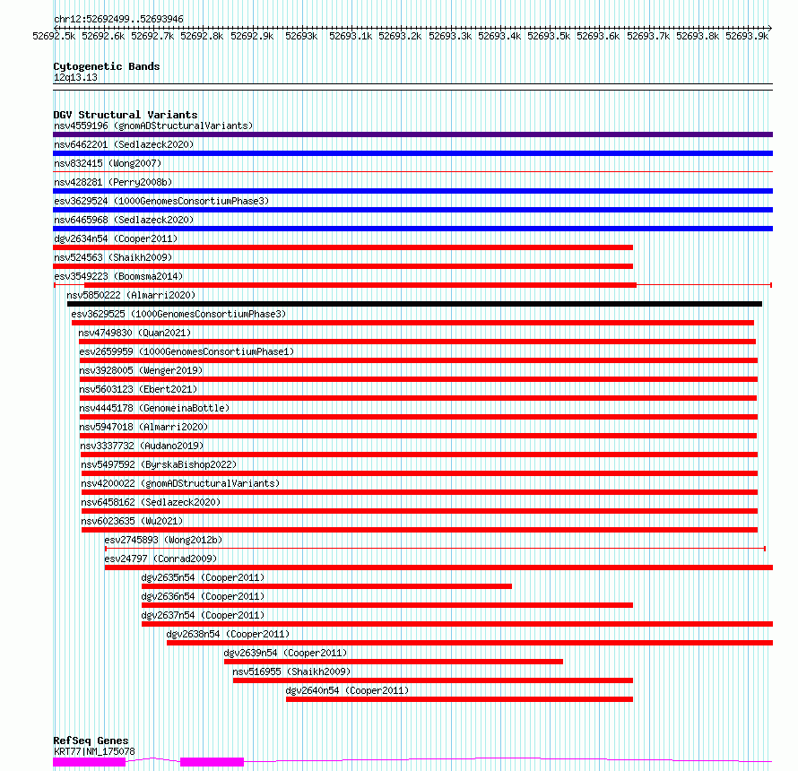 Variant DetailsVariant: esv3549223| Internal ID | 18750299 | | Landmark | | | Location Information | | | Cytoband | 12q13.13 | | Allele length | | Assembly | Allele length | | hg38 | 1448 | | hg19 | 1448 |