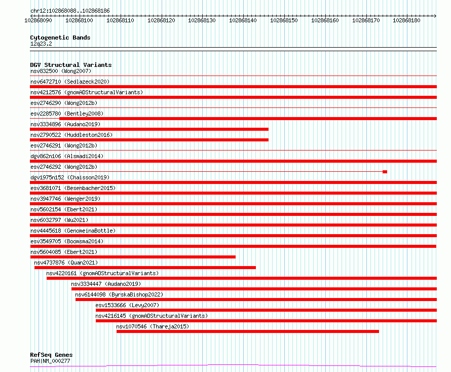 Variant DetailsVariant: esv3549705| Internal ID | 18750781 | | Landmark | | | Location Information | | | Cytoband | 12q23.2 | | Allele length | | Assembly | Allele length | | hg38 | 99 | | hg19 | 99 |