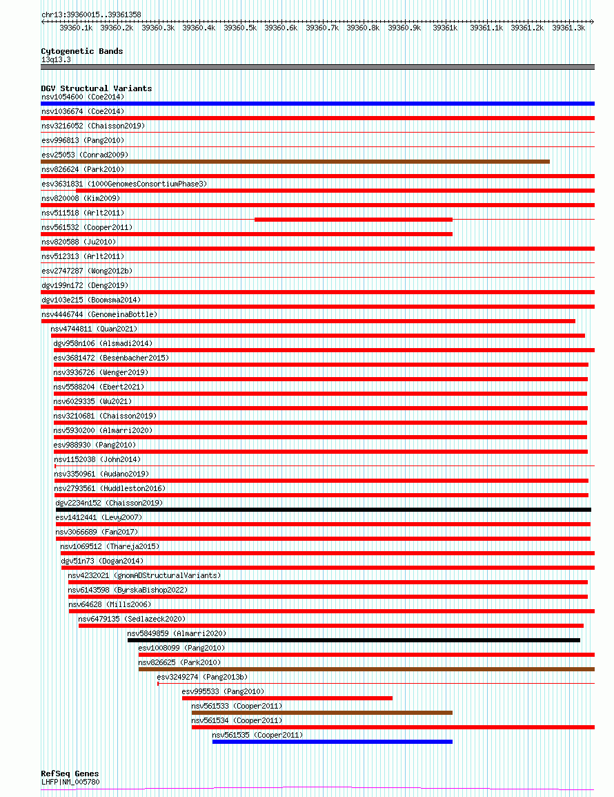 Variant DetailsVariant: esv3550346| Internal ID | 18751422 | | Landmark | | | Location Information | | | Cytoband | 13q13.3 | | Allele length | | Assembly | Allele length | | hg38 | 1344 | | hg19 | 1344 |