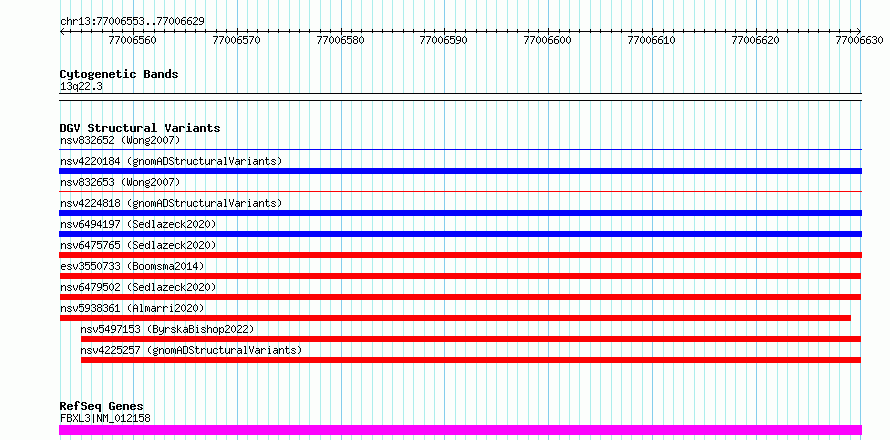 Variant DetailsVariant: esv3550733| Internal ID | 18751809 | | Landmark | | | Location Information | | | Cytoband | 13q22.3 | | Allele length | | Assembly | Allele length | | hg38 | 77 | | hg19 | 77 |