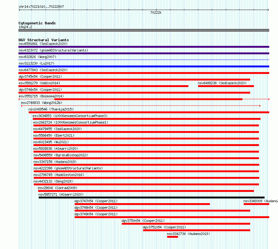 Variant DetailsVariant: esv3551715| Internal ID | 18752791 | | Landmark | | | Location Information | | | Cytoband | 14q24.2 | | Allele length | | Assembly | Allele length | | hg38 | 1798 | | hg19 | 1798 |
