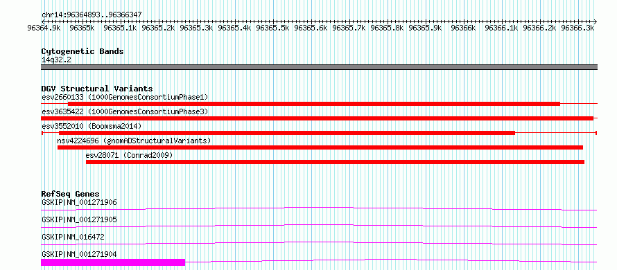 | Variant Type | CNV deletion | Copy Number | | Allele State | | Allele Origin | | Probe Count | | Validation Flag | | Merged Status | M | Merged Variants | | Supporting Variants | essv9750757 | Samples | | Known Genes | GSKIP | Method | Sequencing | Analysis | | Platform | Illumina HiSeq 2000 | Comments | | Reference | Boomsma_et_al_2014 | Pubmed ID | 23714750 | Accession Number(s) | esv3552010