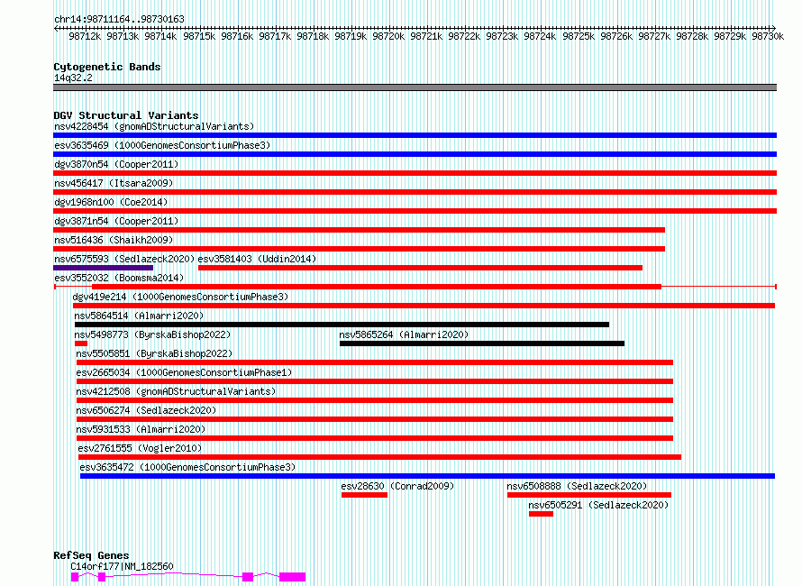 Variant DetailsVariant: esv3552032| Internal ID | 18753108 | | Landmark | | | Location Information | | | Cytoband | 14q32.2 | | Allele length | | Assembly | Allele length | | hg38 | 19000 | | hg19 | 19000 |