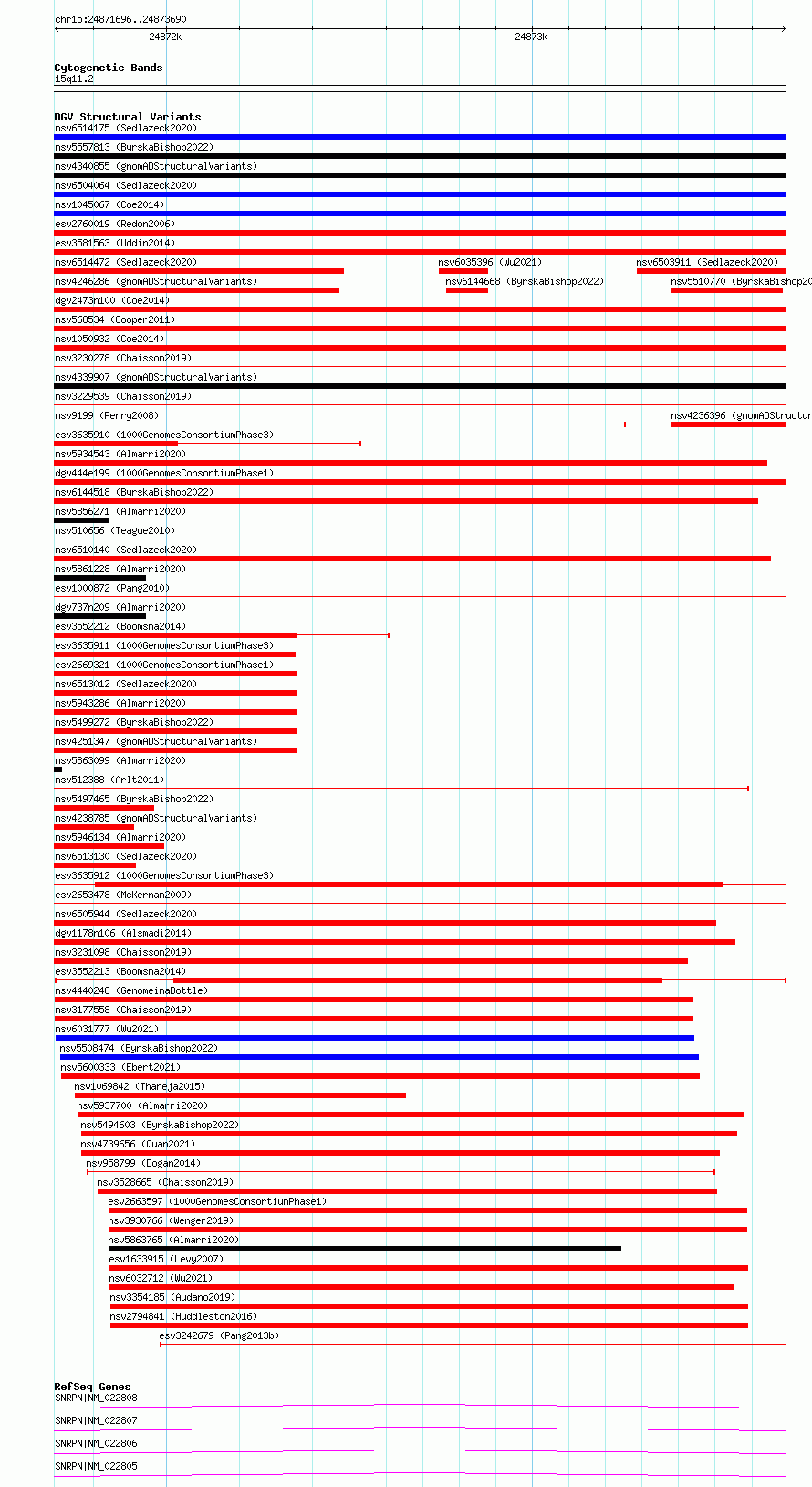 Variant DetailsVariant: esv3552213| Internal ID | 18753289 | | Landmark | | | Location Information | | | Cytoband | 15q11.2 | | Allele length | | Assembly | Allele length | | hg38 | 1995 | | hg19 | 1995 |