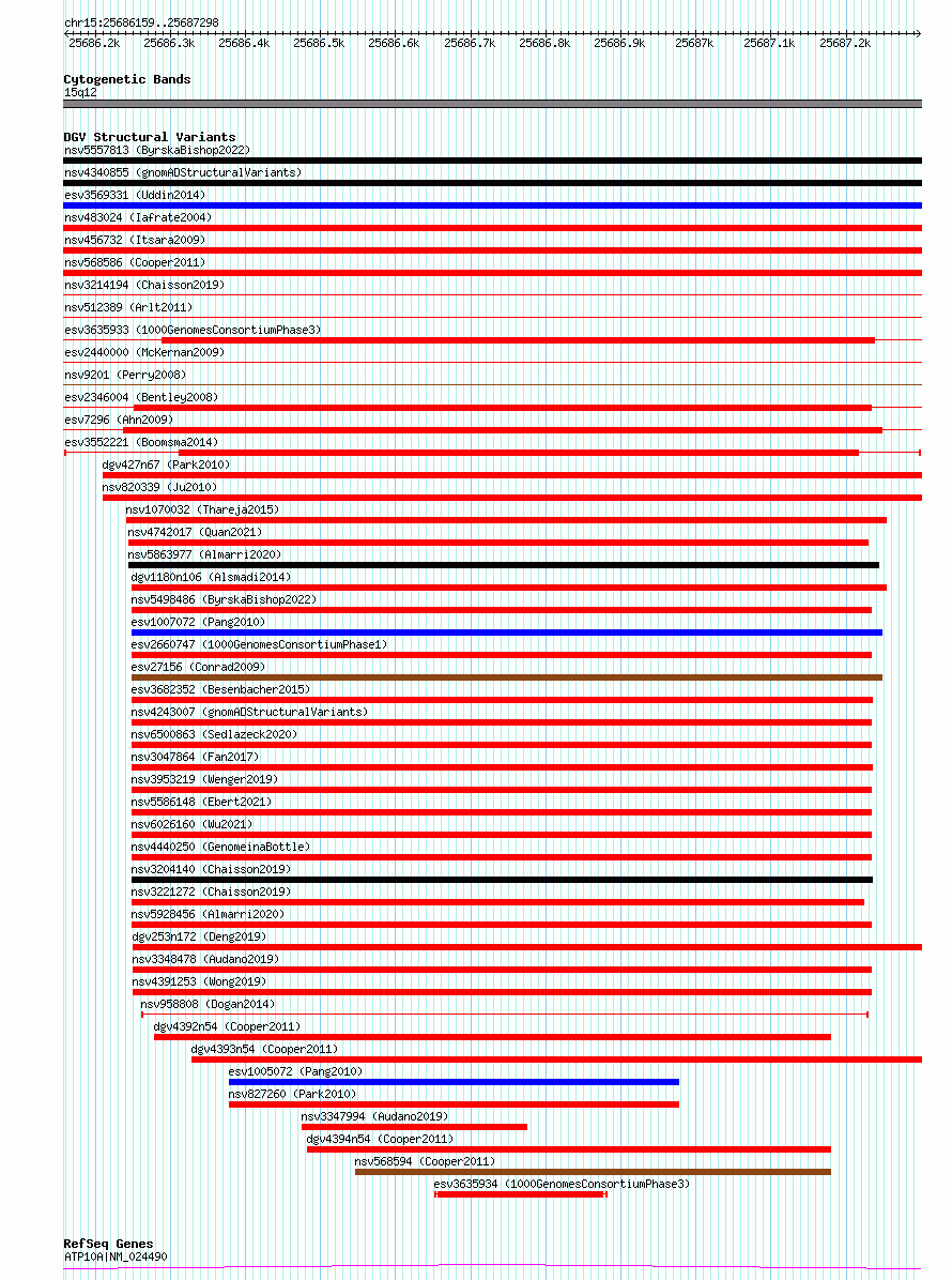 Variant DetailsVariant: esv3552221| Internal ID | 18753297 | | Landmark | | | Location Information | | | Cytoband | 15q12 | | Allele length | | Assembly | Allele length | | hg38 | 1140 | | hg19 | 1140 |