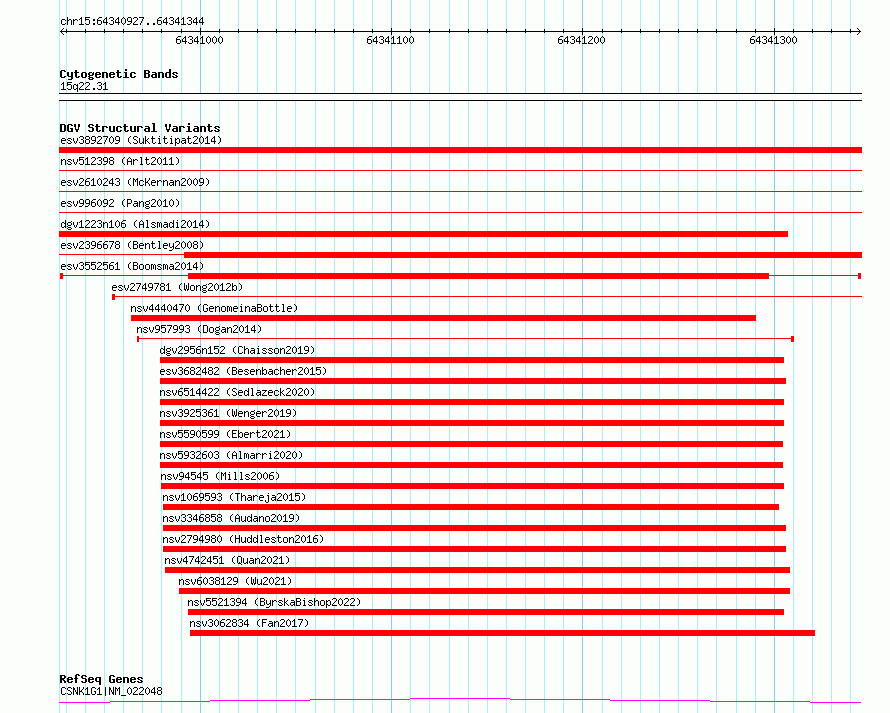 Variant DetailsVariant: esv3552561| Internal ID | 18753637 | | Landmark | | | Location Information | | | Cytoband | 15q22.31 | | Allele length | | Assembly | Allele length | | hg38 | 418 | | hg19 | 418 |