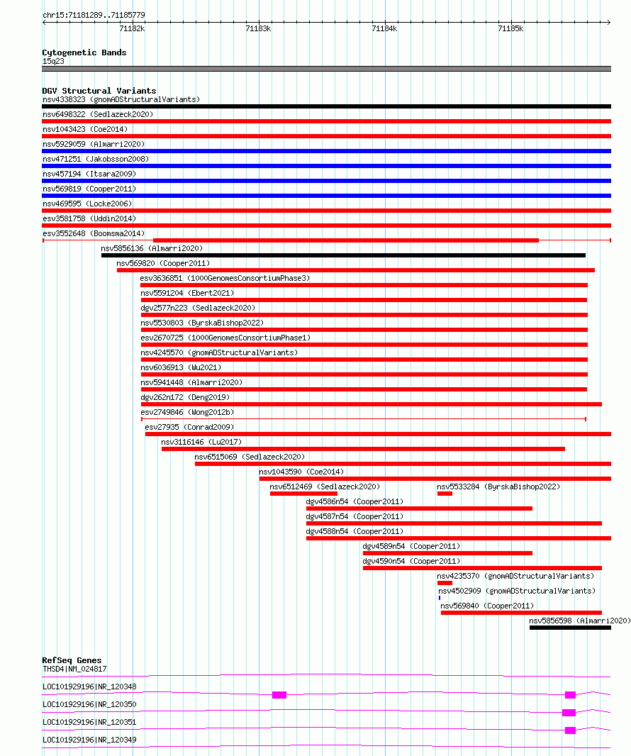 | | Variant Type | CNV deletion | | Copy Number | | | Allele State | | | Allele Origin | | | Probe Count | | | Validation Flag | | | Merged Status | M | | Merged Variants | | | Supporting Variants | essv9751395 | | Samples | | | Known Genes | THSD4 | | Method | Sequencing | | Analysis | | | Platform | Illumina HiSeq 2000 | | Comments | | | Reference | Boomsma_et_al_2014 | | Pubmed ID | 23714750 | | Accession Number(s) | esv3552648
