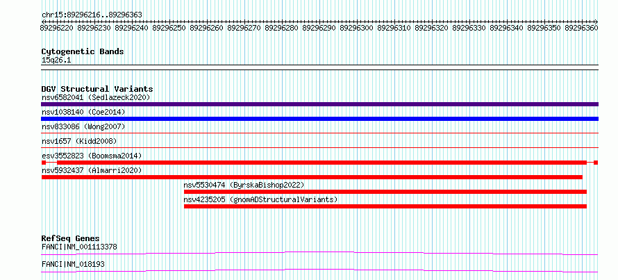 Variant DetailsVariant: esv3552823| Internal ID | 18753899 | | Landmark | | | Location Information | | | Cytoband | 15q26.1 | | Allele length | | Assembly | Allele length | | hg38 | 148 | | hg19 | 148 |