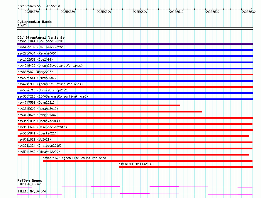 Variant DetailsVariant: esv3552835| Internal ID | 18753911 | | Landmark | | | Location Information | | | Cytoband | 15q26.1 | | Allele length | | Assembly | Allele length | | hg38 | 65 | | hg19 | 65 |