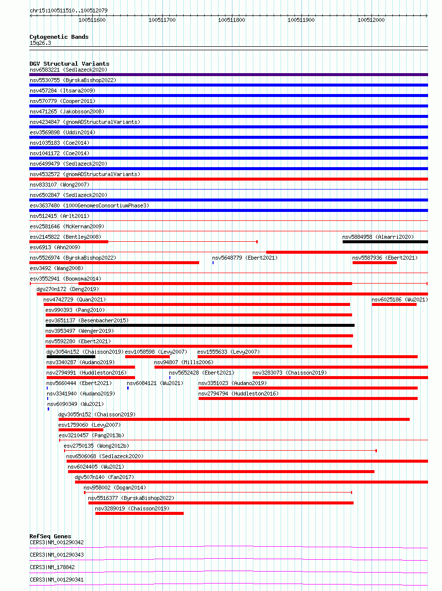 Variant DetailsVariant: esv3552941| Internal ID | 18754017 | | Landmark | | | Location Information | | | Cytoband | 15q26.3 | | Allele length | | Assembly | Allele length | | hg38 | 570 | | hg19 | 570 |