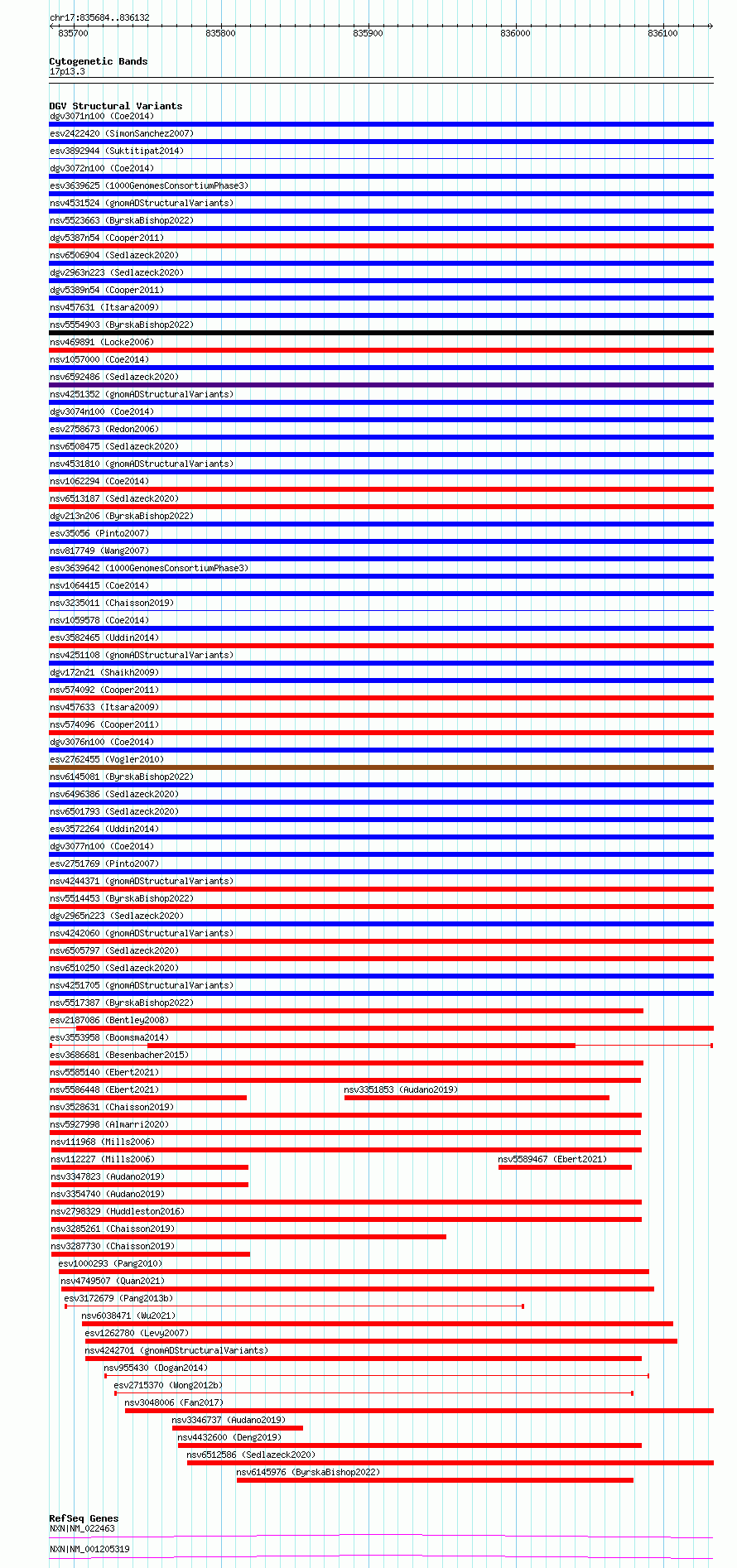 Variant DetailsVariant: esv3553958| Internal ID | 18755034 | | Landmark | | | Location Information | | | Cytoband | 17p13.3 | | Allele length | | Assembly | Allele length | | hg38 | 449 | | hg19 | 449 |