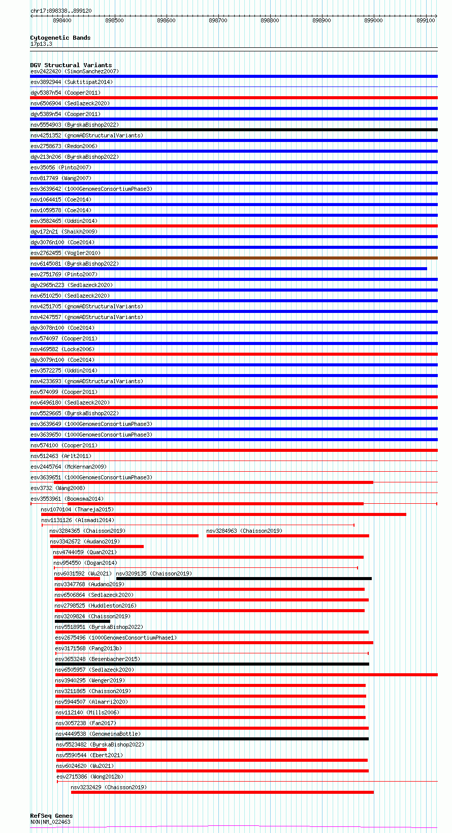Variant DetailsVariant: esv3553961| Internal ID | 18755037 | | Landmark | | | Location Information | | | Cytoband | 17p13.3 | | Allele length | | Assembly | Allele length | | hg38 | 783 | | hg19 | 783 |