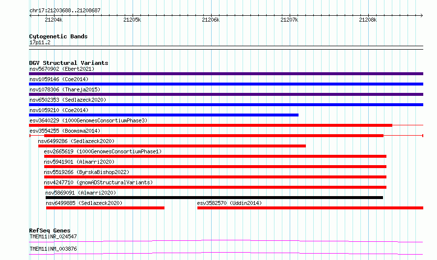 Variant DetailsVariant: esv3554255| Internal ID | 18755331 | | Landmark | | | Location Information | | | Cytoband | 17p11.2 | | Allele length | | Assembly | Allele length | | hg38 | 5000 | | hg19 | 5000 |