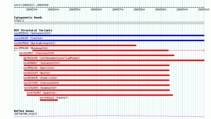 Variant DetailsVariant: esv3554286| Internal ID | 18755362 | | Landmark | | | Location Information | | | Cytoband | 17q11.2 | | Allele length | | Assembly | Allele length | | hg38 | 883 | | hg19 | 883 |