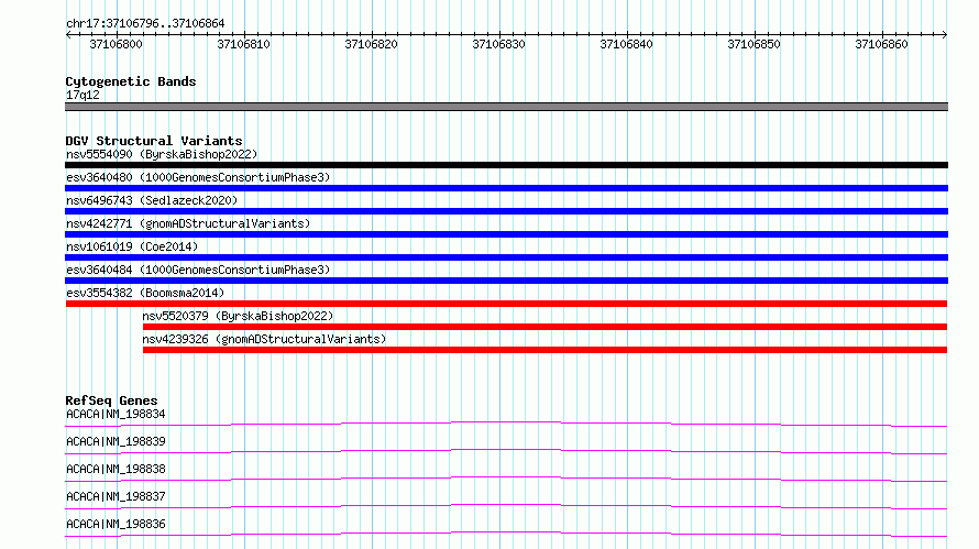 Variant DetailsVariant: esv3554382| Internal ID | 18755458 | | Landmark | | | Location Information | | | Cytoband | 17q12 | | Allele length | | Assembly | Allele length | | hg38 | 69 | | hg19 | 69 |