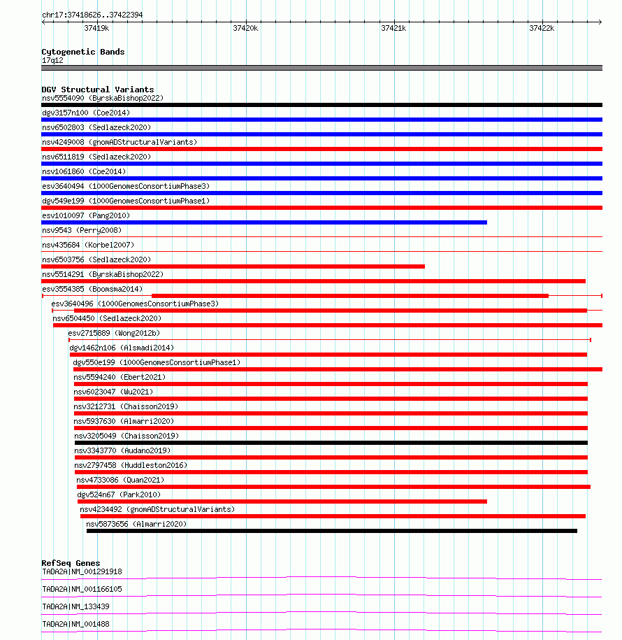Variant DetailsVariant: esv3554385| Internal ID | 18755461 | | Landmark | | | Location Information | | | Cytoband | 17q12 | | Allele length | | Assembly | Allele length | | hg38 | 3769 | | hg19 | 3790 |