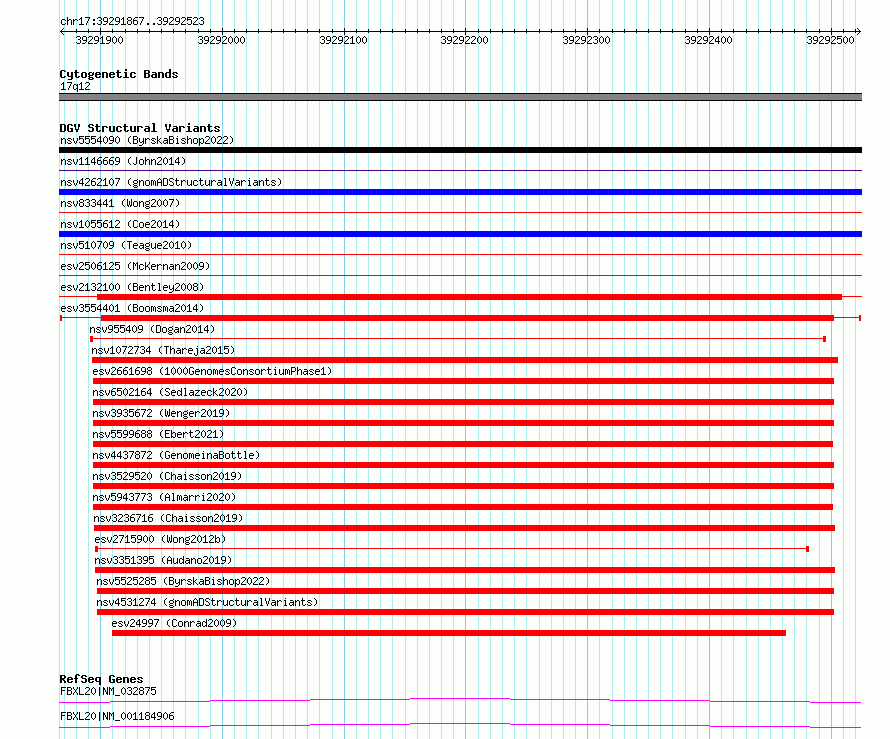Variant DetailsVariant: esv3554401| Internal ID | 18755477 | | Landmark | | | Location Information | | | Cytoband | 17q12 | | Allele length | | Assembly | Allele length | | hg38 | 657 | | hg19 | 657 |