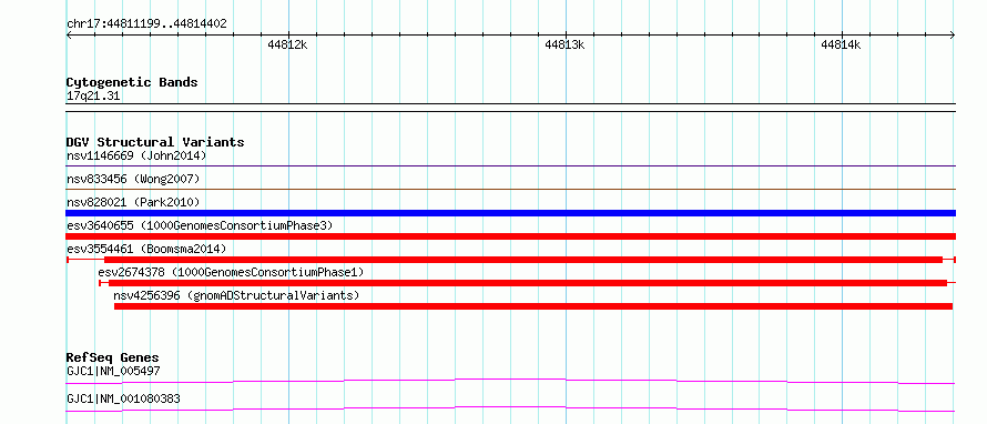 Variant DetailsVariant: esv3554461| Internal ID | 18408851 | | Landmark | | | Location Information | | | Cytoband | 17q21.31 | | Allele length | | Assembly | Allele length | | hg38 | 3204 | | hg19 | 3204 |