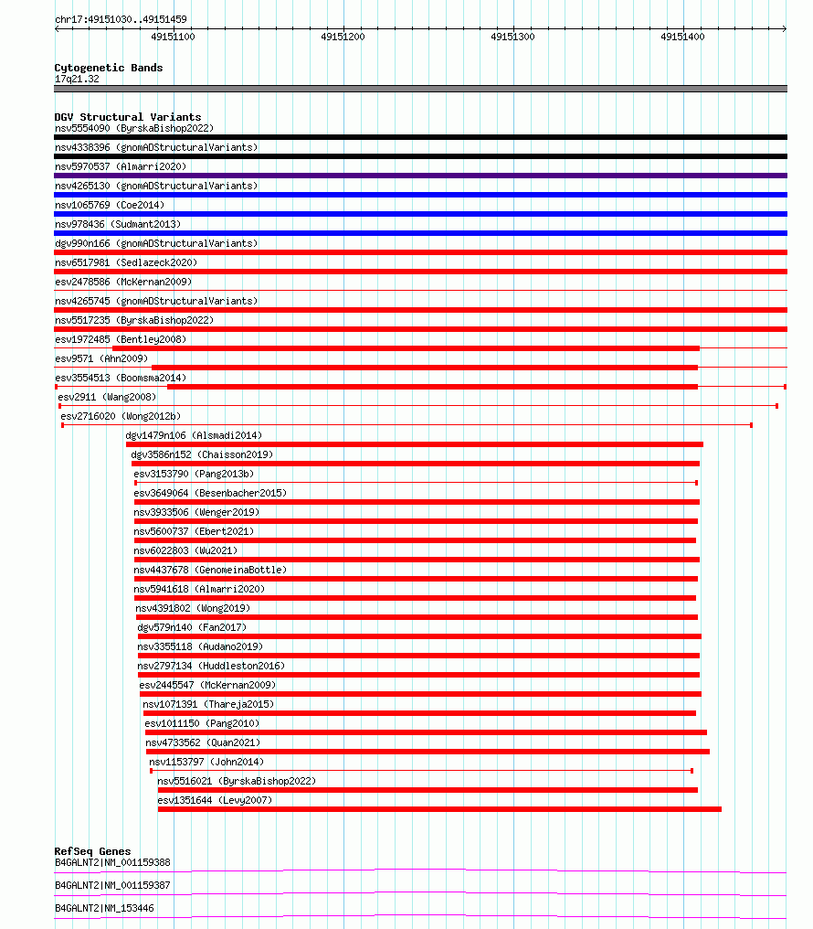 Variant DetailsVariant: esv3554513| Internal ID | 18755589 | | Landmark | | | Location Information | | | Cytoband | 17q21.32 | | Allele length | | Assembly | Allele length | | hg38 | 430 | | hg19 | 430 |