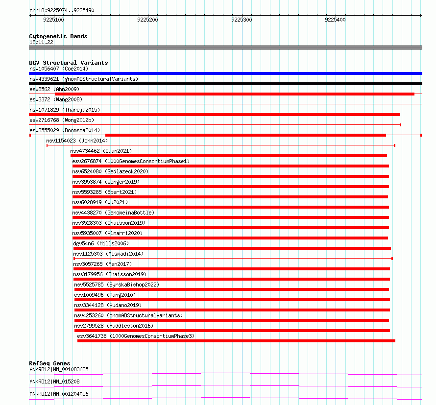 Variant DetailsVariant: esv3555029| Internal ID | 18756105 | | Landmark | | | Location Information | | | Cytoband | 18p11.22 | | Allele length | | Assembly | Allele length | | hg38 | 417 | | hg19 | 417 |