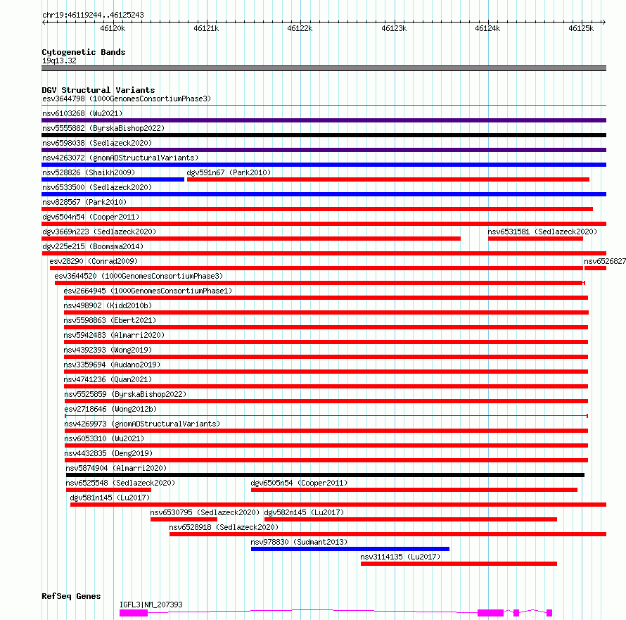Variant DetailsVariant: esv3556473| Internal ID | 18757549 | | Landmark | | | Location Information | | | Cytoband | 19q13.32 | | Allele length | | Assembly | Allele length | | hg38 | 6000 | | hg19 | 6000 |