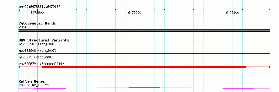 Variant DetailsVariant: esv3556791| Internal ID | 18757867 | | Landmark | | | Location Information | | | Cytoband | 20p12.3 | | Allele length | | Assembly | Allele length | | hg38 | 257 | | hg19 | 257 |