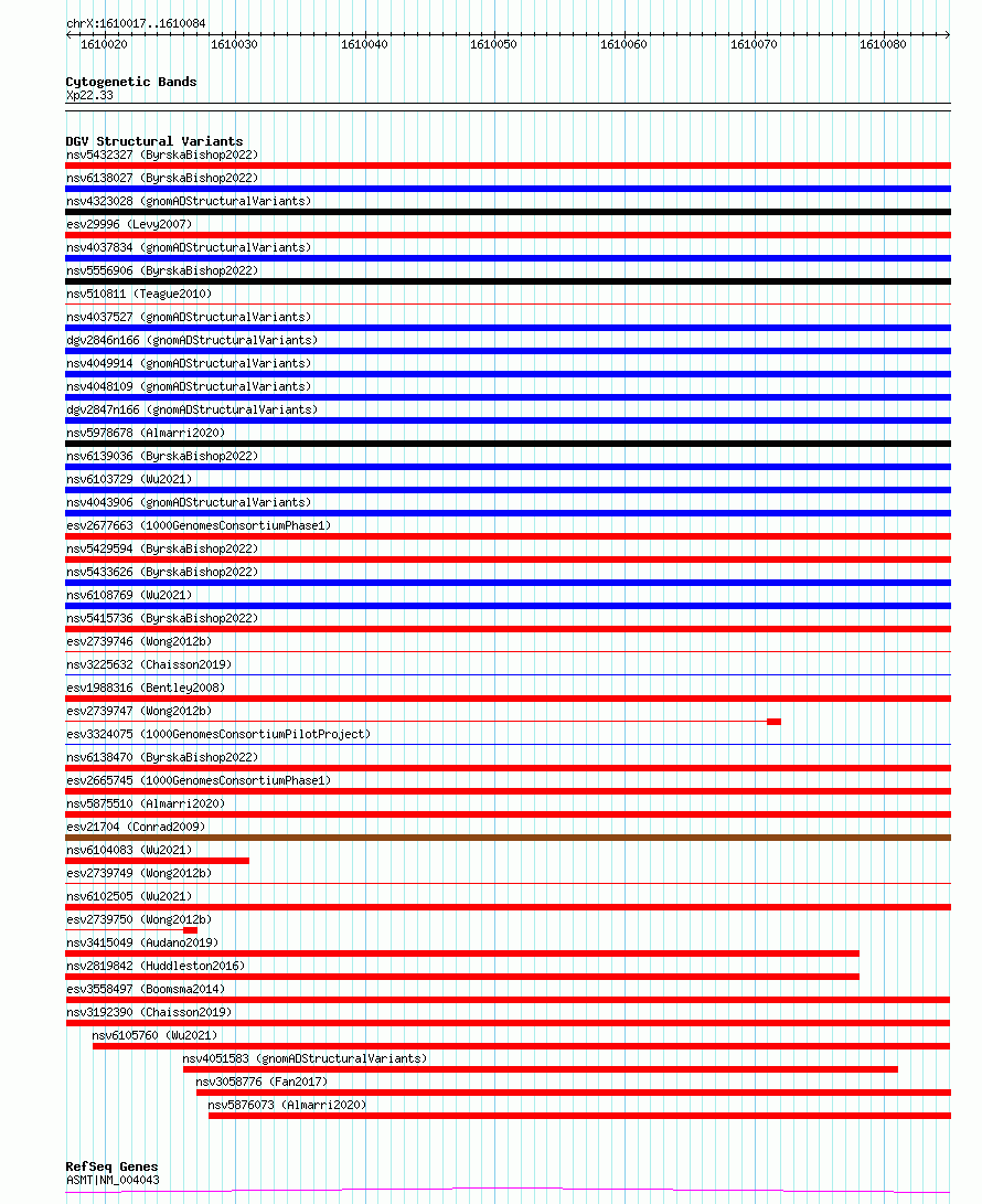 Variant DetailsVariant: esv3558497| Internal ID | 18759573 | | Landmark | | | Location Information | | | Cytoband | Xp22.33 | | Allele length | | Assembly | Allele length | | hg38 | 68 | | hg19 | 68 |