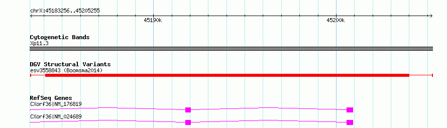 Variant DetailsVariant: esv3558843| Internal ID | 18759919 | | Landmark | | | Location Information | | | Cytoband | Xp11.3 | | Allele length | | Assembly | Allele length | | hg38 | 22000 | | hg19 | 22000 |